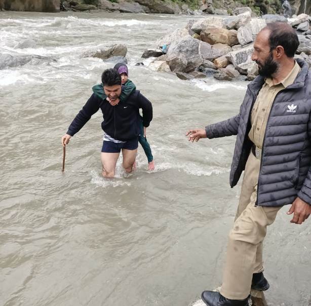 Appericiably, SDPO Gandoh jumped out from his official vehicle and without judging the flow of water jumped into the river and after hectic efforts putting life in danger reached upto little Angel Arima aging aaound 6 years and picked her out from the river & saved her precious life.