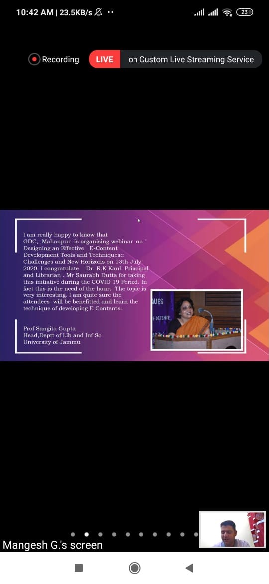 KATHUA, July 15: Government Degree College, Mahanpur, Kathua organised and conducted a national webinar on “Designing an effective E-Content Development Tools & Techniques: Challenges & New Horizons” on Zoom & YouTube Platform on 13th of July 2020 in collaboration with Library & IQAC Cell under the dynamic patronship of Dr. Rakesh Kumar Koul, Principal, GDC, Mahanpur.