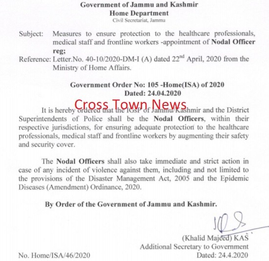 Jammu, April 24: Govt appointed a Nodal Officer to take Measures to ensure protection to Healthcare professionals, copy with CTN reads as:-