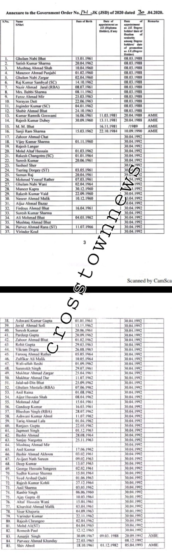 Jammu, May 06: Govt issued Final Seniority list of 781 JE's (Civil) Degree Holders, copy with CTN reads as:-