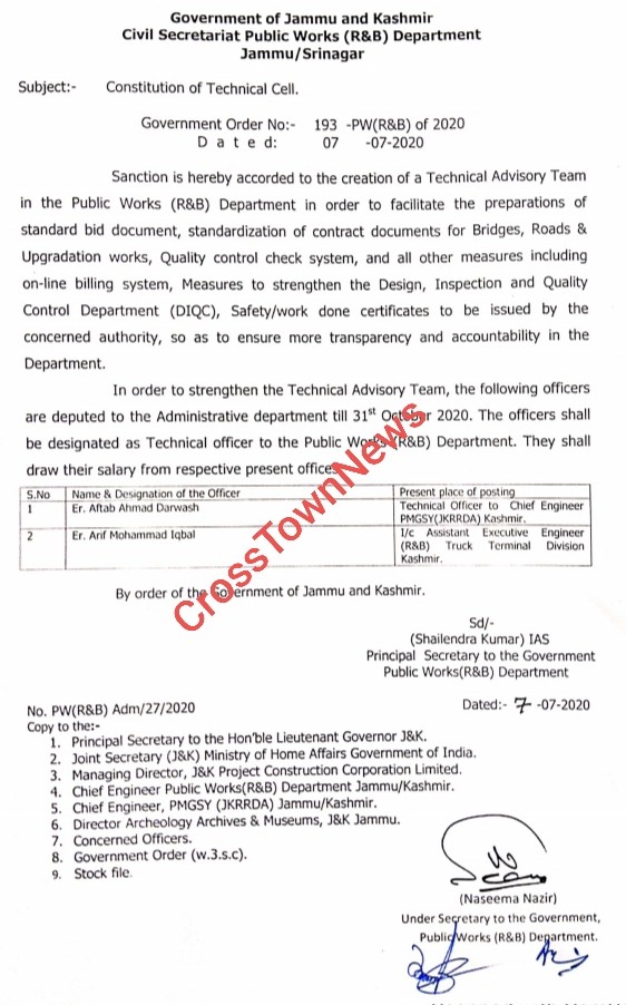 Jammu, July 08: Shailendra Kumar, Pr Secretary, PWD Jammu and Kashmir constituted a Technical cell, copy with CTN reads as:-