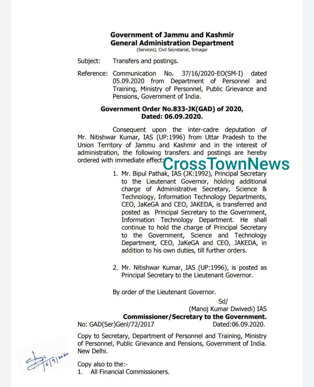 Jammu, Sep 06: Jamm and Kashmir Govt ordered transfers and postings of IAS Officers;Nitishwar Kumar posted as Principal Secretary to LG J&K.