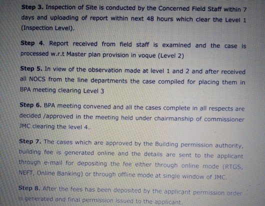 Step-3 reads with inspection of site by the concerned within 7 days and uploading within next 48 hours, which clear the level-1, which is being further followed by Step- 4,5,6,7,8 etc etc. for sanction of building permission of the concerned.