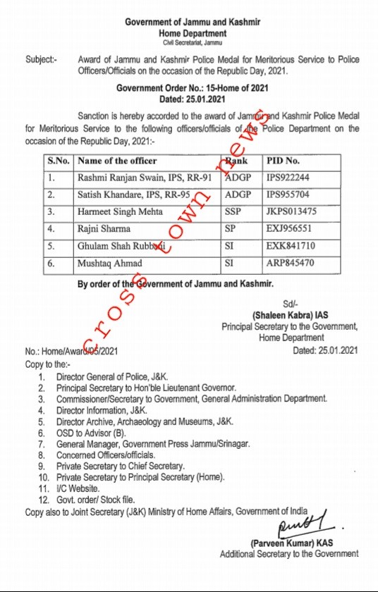 Jammu, Jan 25: Govt issued orders for Award of JK Police Medal for Meritorious Service to Police Officers on occasion of Republic Day, copy with CTN reads as:-