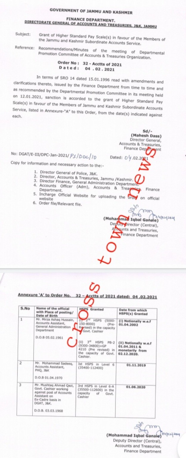 Jammu, Feb 06: Govt issue orders for Grant of Higher Standard Pay scales in favour of members of J&K Subordinate Accounts Services, order copy with CTN reads as:-