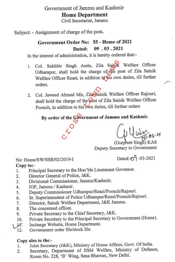 Jammu, March 10: J&K Home department issued orders for assignment of charge of the post, copy with CTN reads as:-
