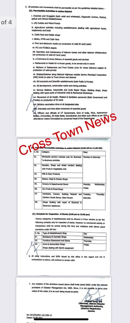Jammu, May 23: Lockdown Extension :DC Jammu issued order for List of permissible & partially permissible activities in Jammu.