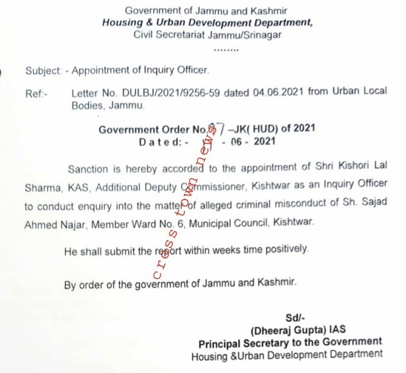 Jammu, June 28: Jammu and Kashmir Govt issued orders for appointment of Inquiry Officer, details with CTN reads as:-