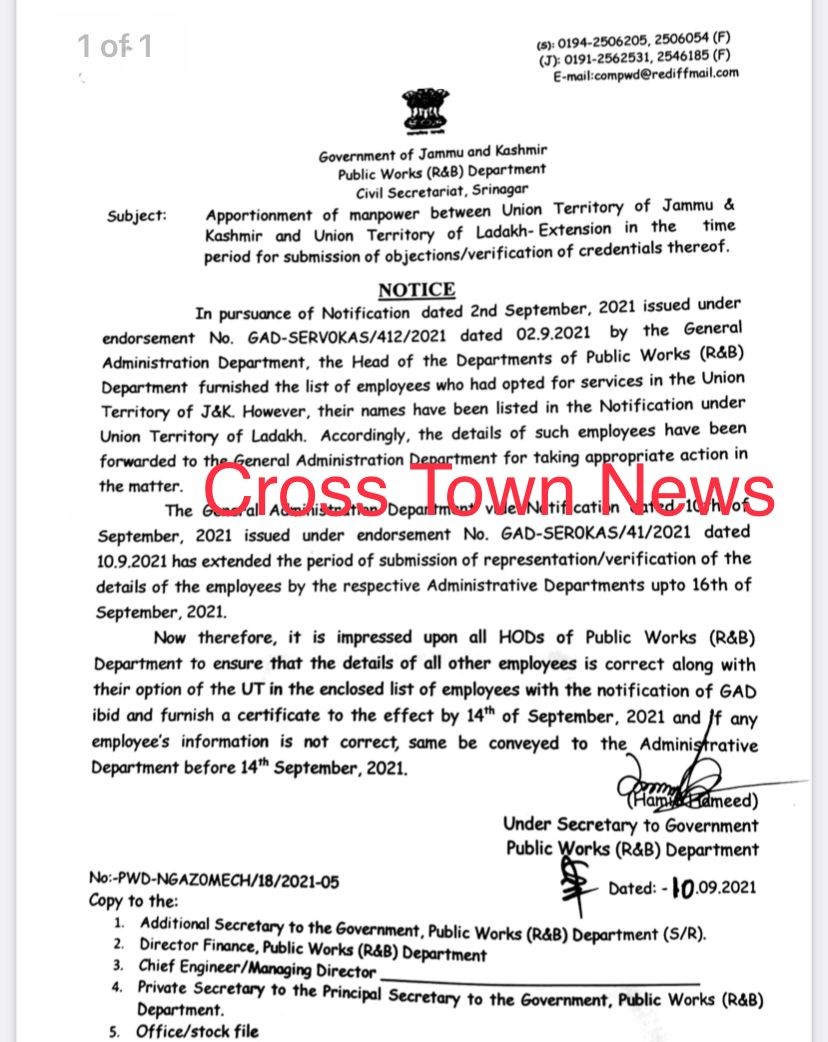 JAMMU, Sep 14: JKPWD dept issues communication over apportionment of manpower between J&K & Ladakh.