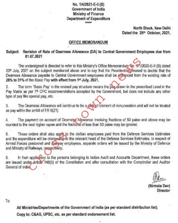 New Delhi, October 25: Govt clarified regarding revision of rate of DA to Central Govt employees due from 1.7.2021, details with CTN reads as:-