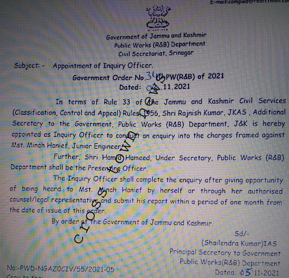 Jammu, Nov 04: Govt issued orders for appointment of Inquiry Officer to enquire charges against an female Engineer, details with CTN reads as:-