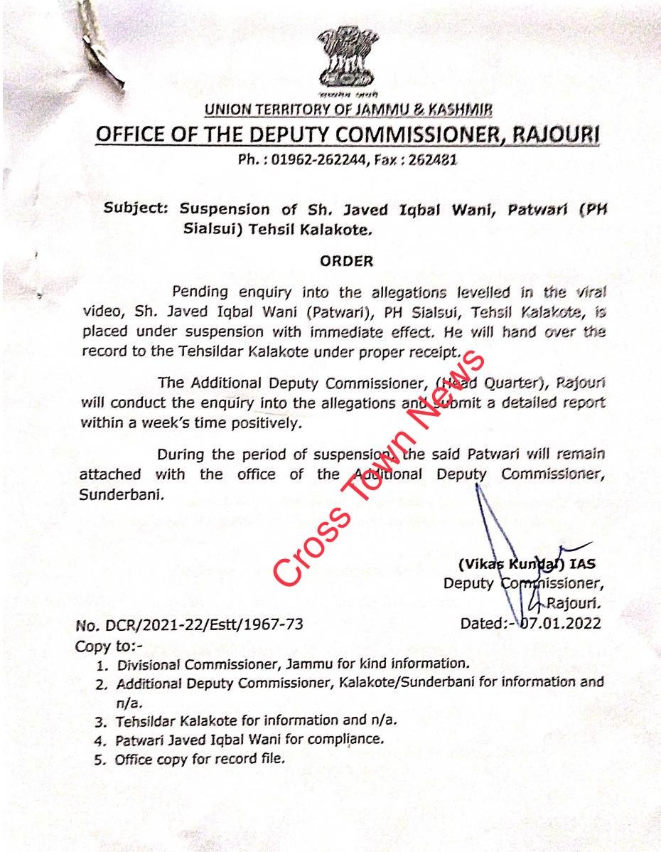 RAJOURI , Jan 08: DC Rajouri Vikas Kundal suspended Patwari.