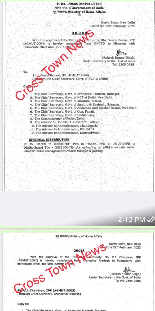 NEW DELHI, Feb 23: MHA ordered transfer of two IPS Officers of AGMUT cadre.
