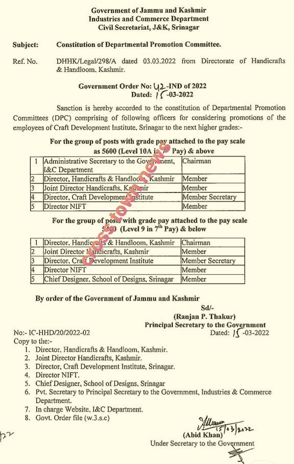 Jammu, March 16:Jammu and Kashmir Govt ordered for Constitution of Departmental Promotion Committee, copy with CTN reads as:-