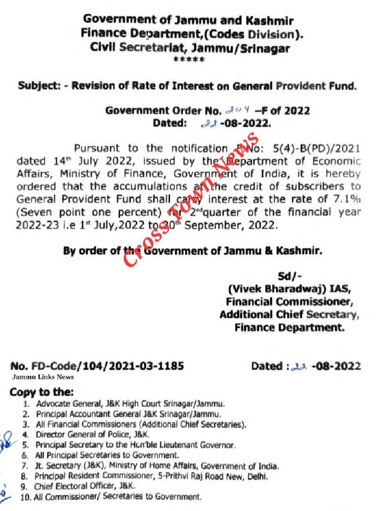 JAMMU, Aug 23: Revision of rate of Interest of General Provident Fund in J&K.