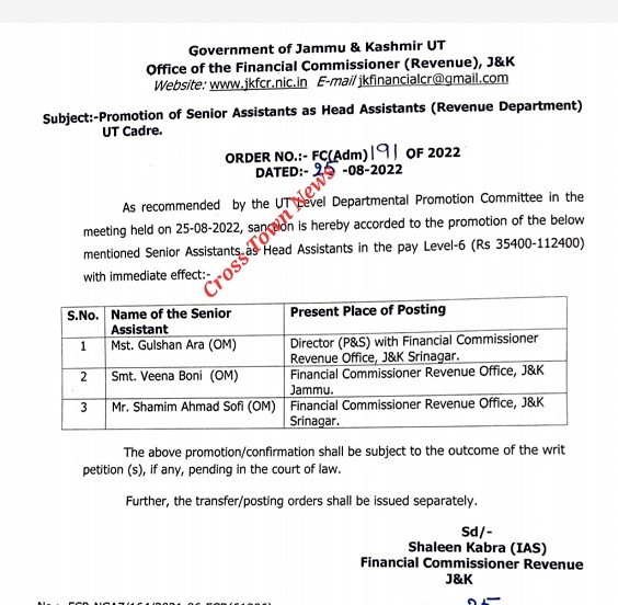 Promotions as Head Assistants in J&K