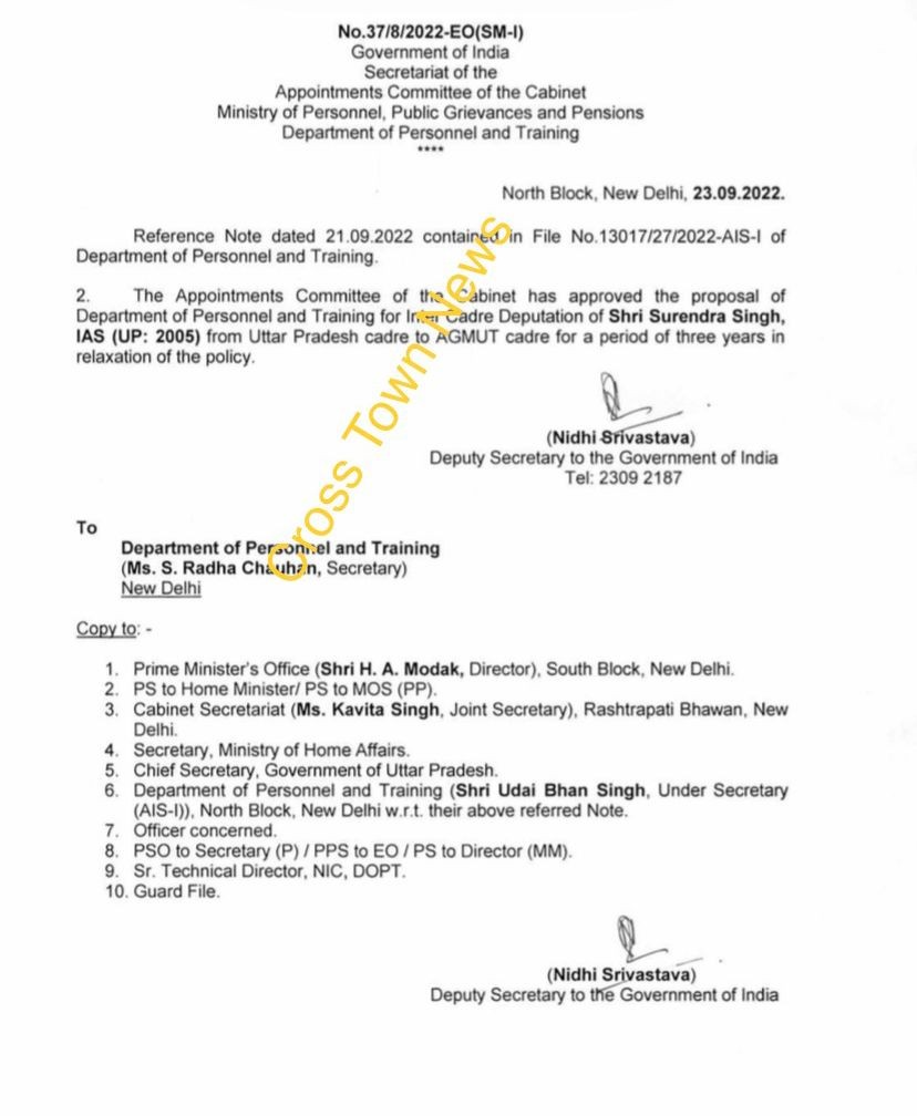 NEW Delhi, Sep 24: Centre approved inter cadre deputation of UP cadre IAS Officer Surendra Singh to AGMUT.